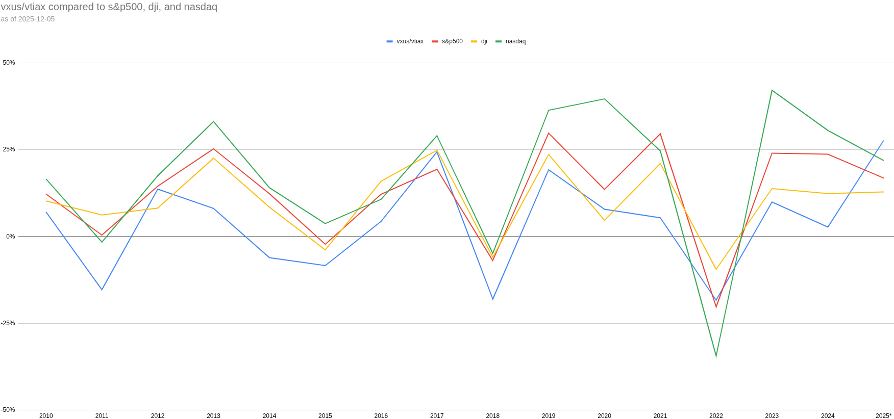 a: "vxus/vtiax will outperform all of the major us indexes in 2025" I am finally vindicated! Joking, of course, since having a larger-than-suggested allocation to emerging markets has hurt my returns for probably close to two decades. -Paul
